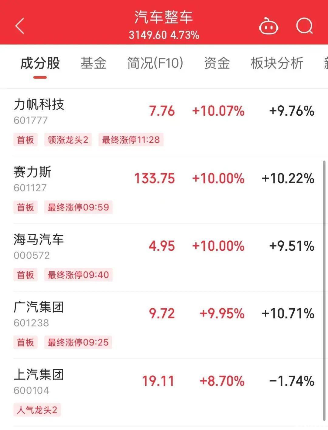 12月2日,汽车整车板块执续走强。适度发稿前,个股方面,广汽集团(601238.SH)、赛力斯(601127.SH)、力帆科技(601777.SH)、海马汽车(000572.SZ)涨停,上汽集团、福田汽车等跟涨。涨停个股中,赛力斯、广汽集团等在讯息面上均出现赫然利好。
